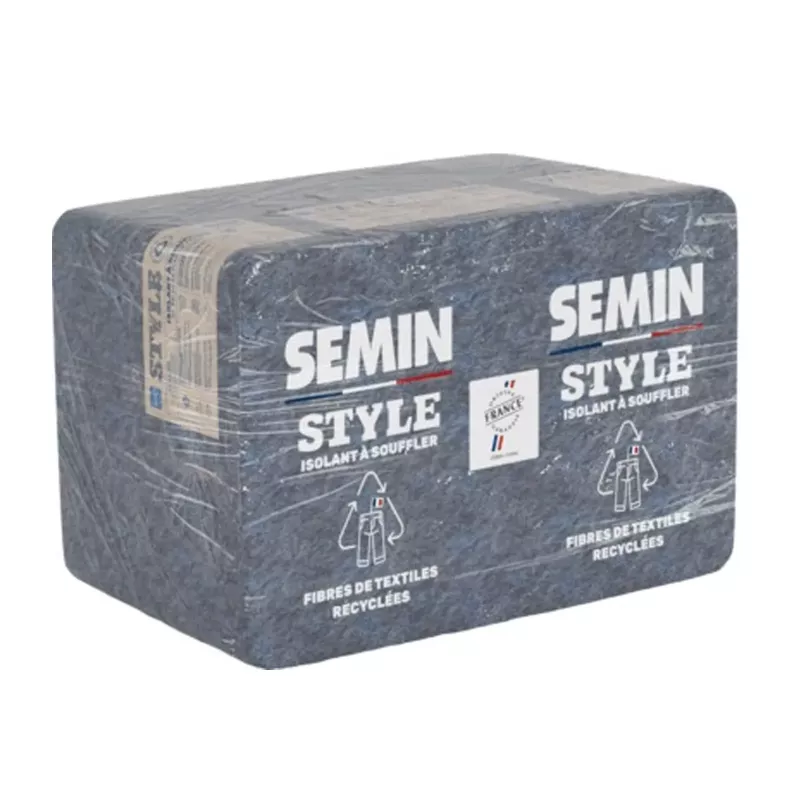 Fibres de coton en vrac issues du recyclage de textiles, Semin Style est applicable par soufflage pour l’isolation thermique et acoustique, en neuf ou en rénovation. Ses performances lui permettent d’offrir un excellent confort en été comme en hiver.